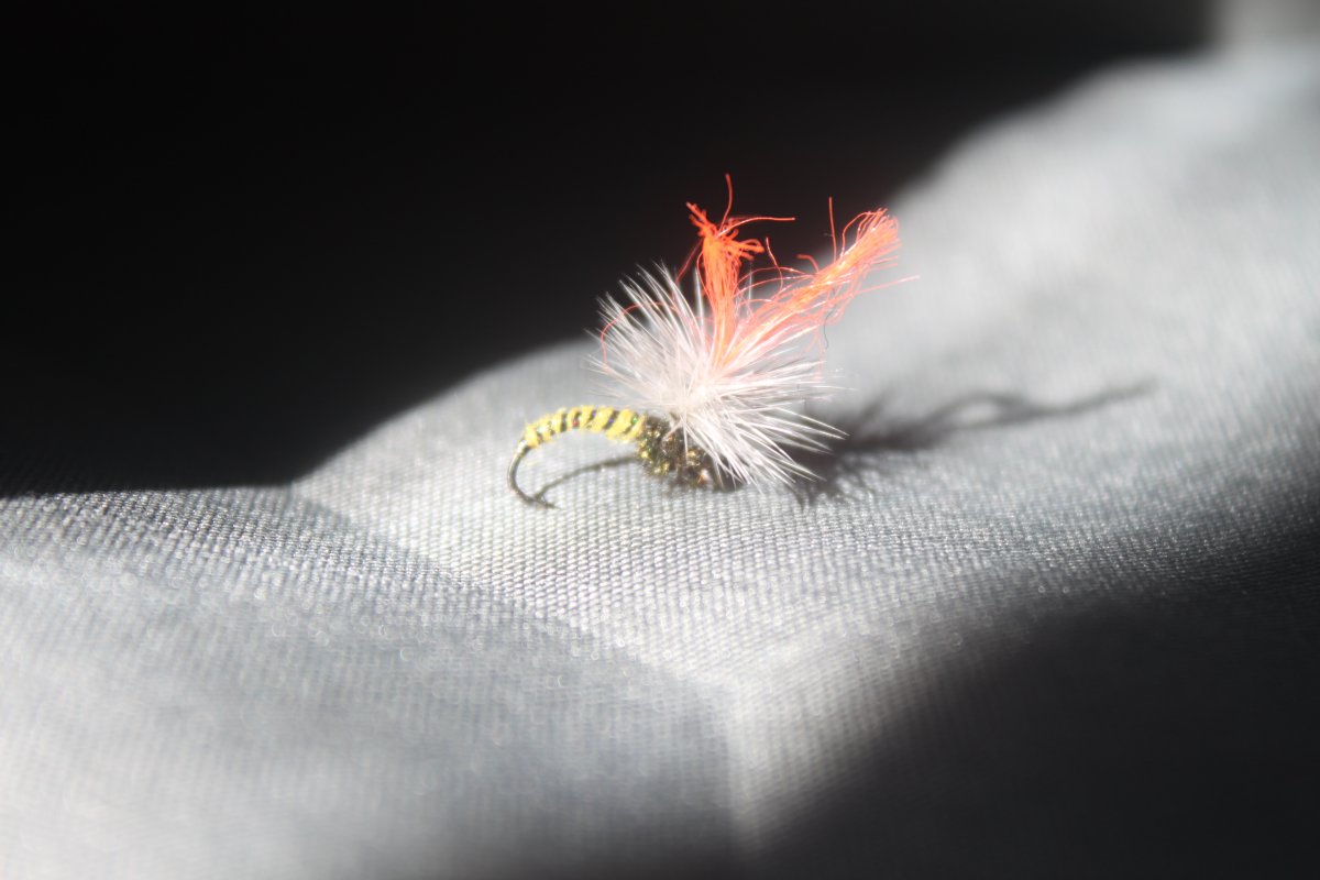 Den gula klinkhammern fungerar bra under kläckning av dagsländor, den är bunden med en high vis post vilket gör att den lätt hittas på vattenytan.